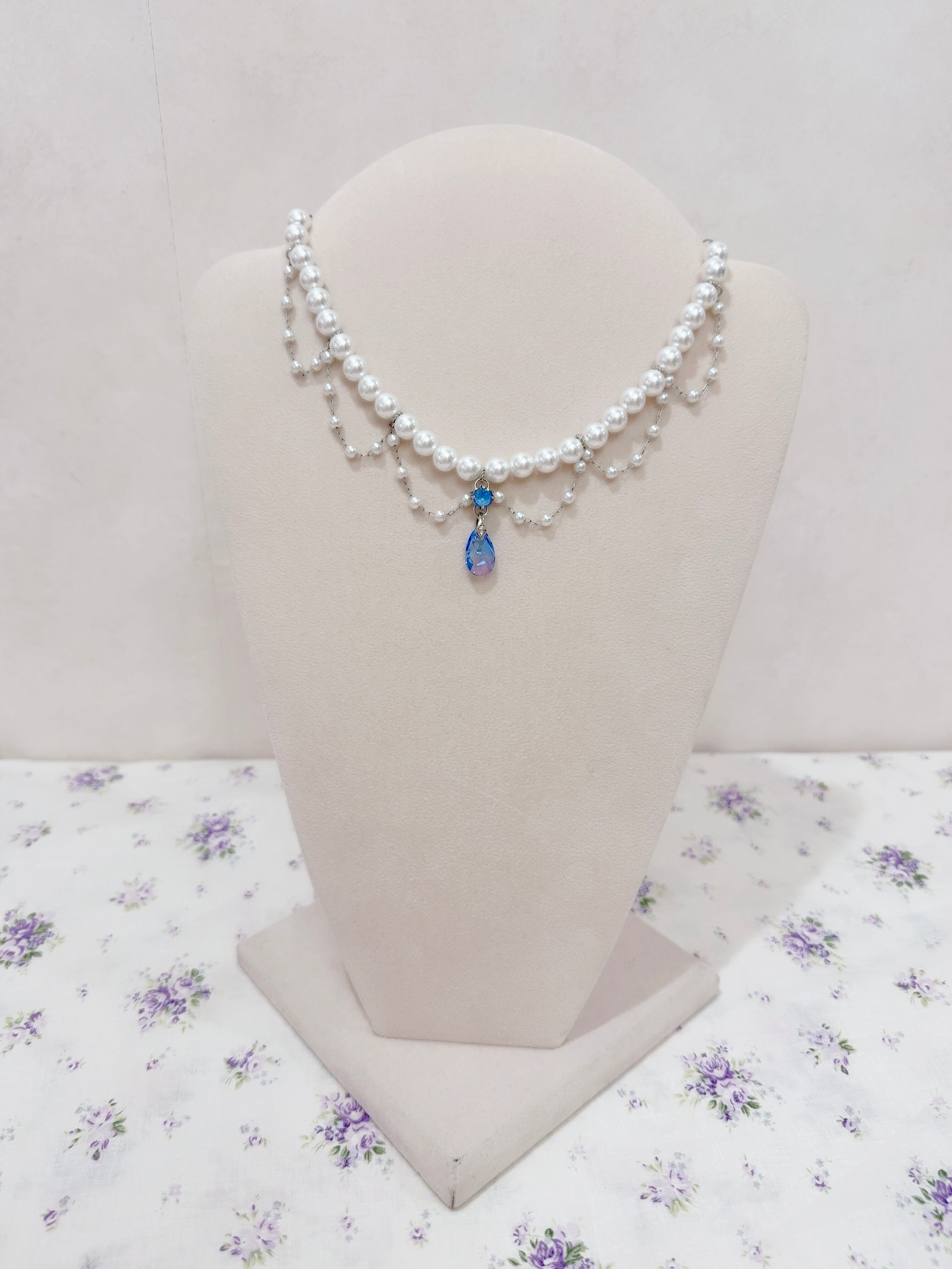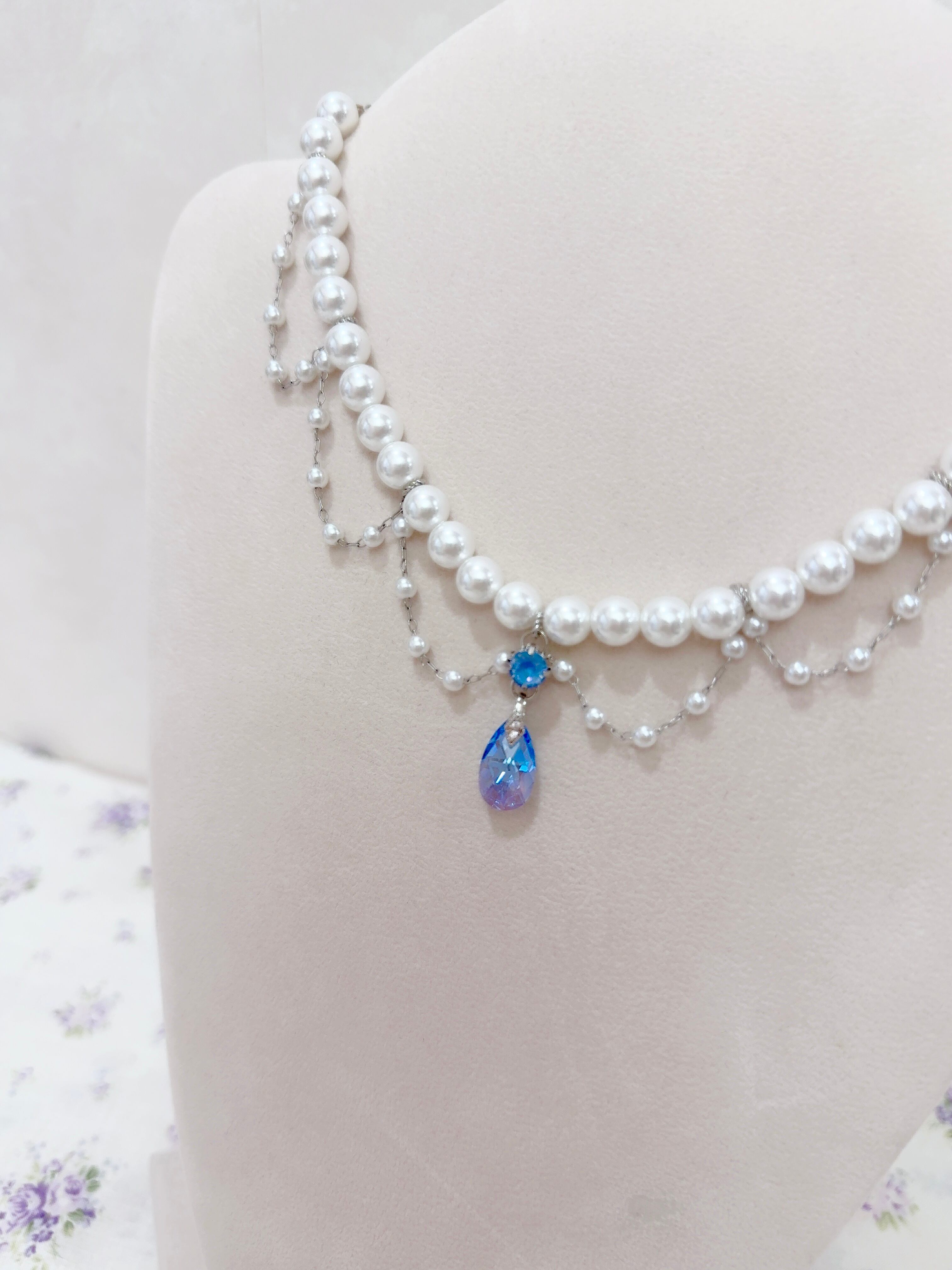 繊細なパールとクリスタルガラスの短めのネックレス